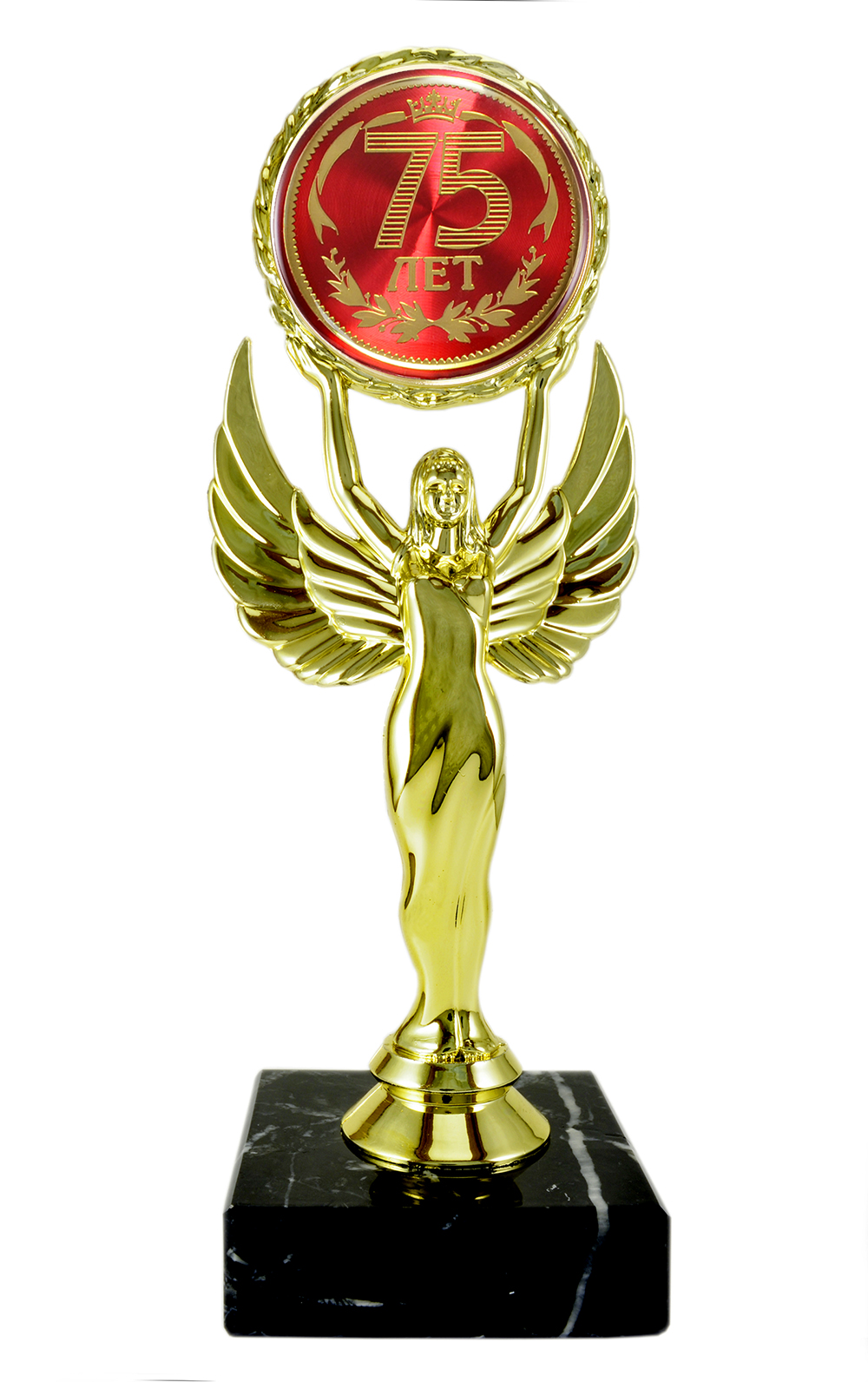 Статуэтка Ника с эмблемоносителем на мраморном камне "С Юбилеем 75 лет"