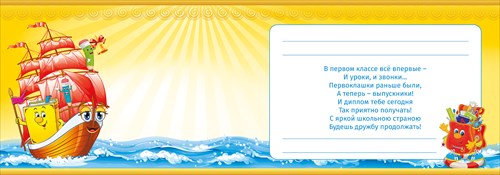 Яркий диплом выполненный из качественного плотного картона. На развороте есть строки для заполнения информации о ребенке и красивое поздравление в стихотворной форме.