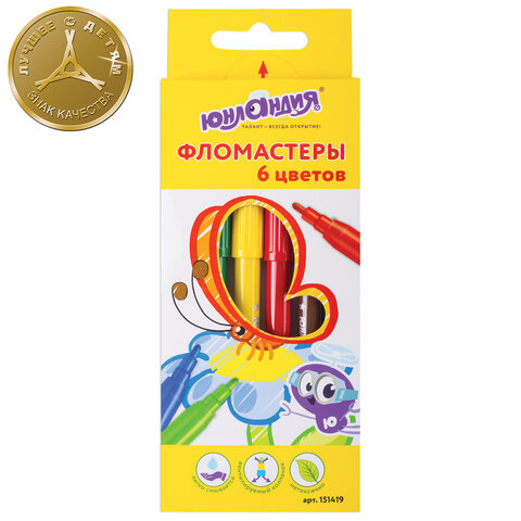 Фломастерами ЮНЛАНДИЯ "ЭКЗОТИКА" настолько удобно рисовать и раскрашивать, что с этим справится даже самый юный художник.Обладают яркими насыщенными цветами. Удобная круглая форма корпуса. Фломастеры изготовлены на водной основе, поэтому они безопасны и легко смываются с большинства материалов и кожи. Наконечник, устойчивый к продавливанию, не проваливается внутрь корпуса и не деформируется даже при сильном нажатии. Полипропиленовый корпус значительно продлевает срок службы фломастеров. Колпачок имеет специальные прорези для вентиляции, которые способствуют прохождению воздуха при попадании в дыхательные пути малыша. Рекомендованы для детей от 3-х лет.