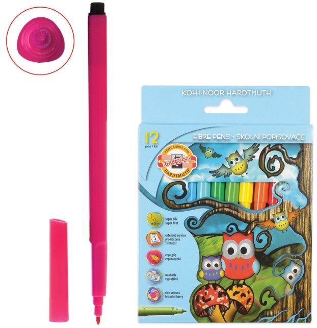 Фломастеры 12 цветов, смываемые, трехгранные KOH-I-NOOR "Совы" 771012AB02KS