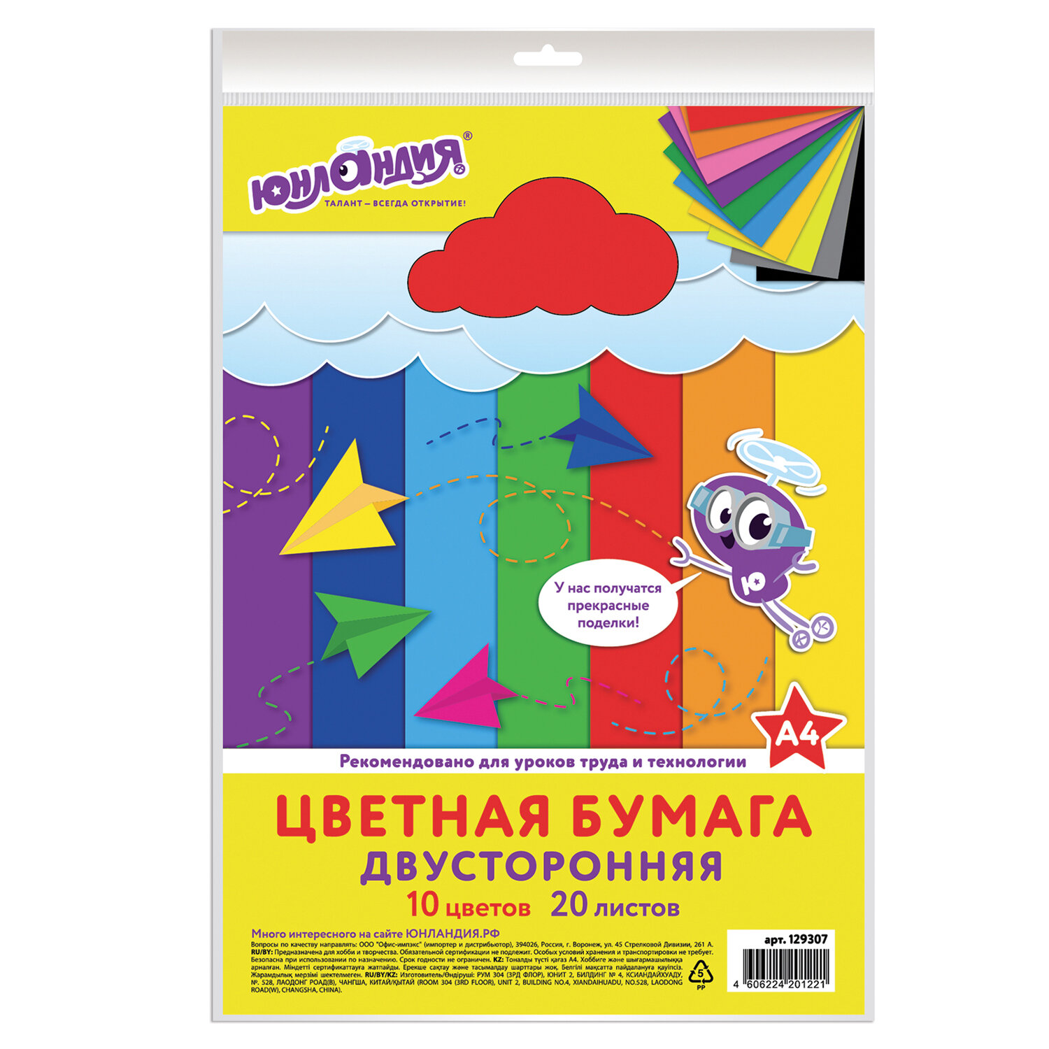 Набор двусторонней цветной бумаги плотностью 80 г/м2 включает 20 листов формата А4 10 различных цветов. Листы удобно упакованы в полиэтиленовый пакет с липким краем.