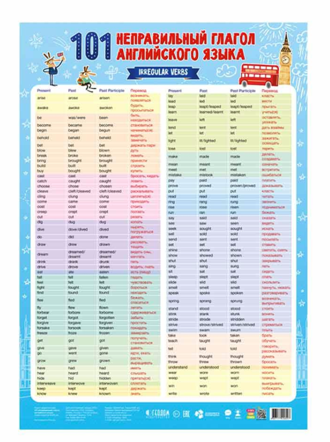 Дидактический плакат “101 неправильный глагол английского языка” поможет ребенку быстро запомнить необходимые слова и выучить иностранный язык без усилий.