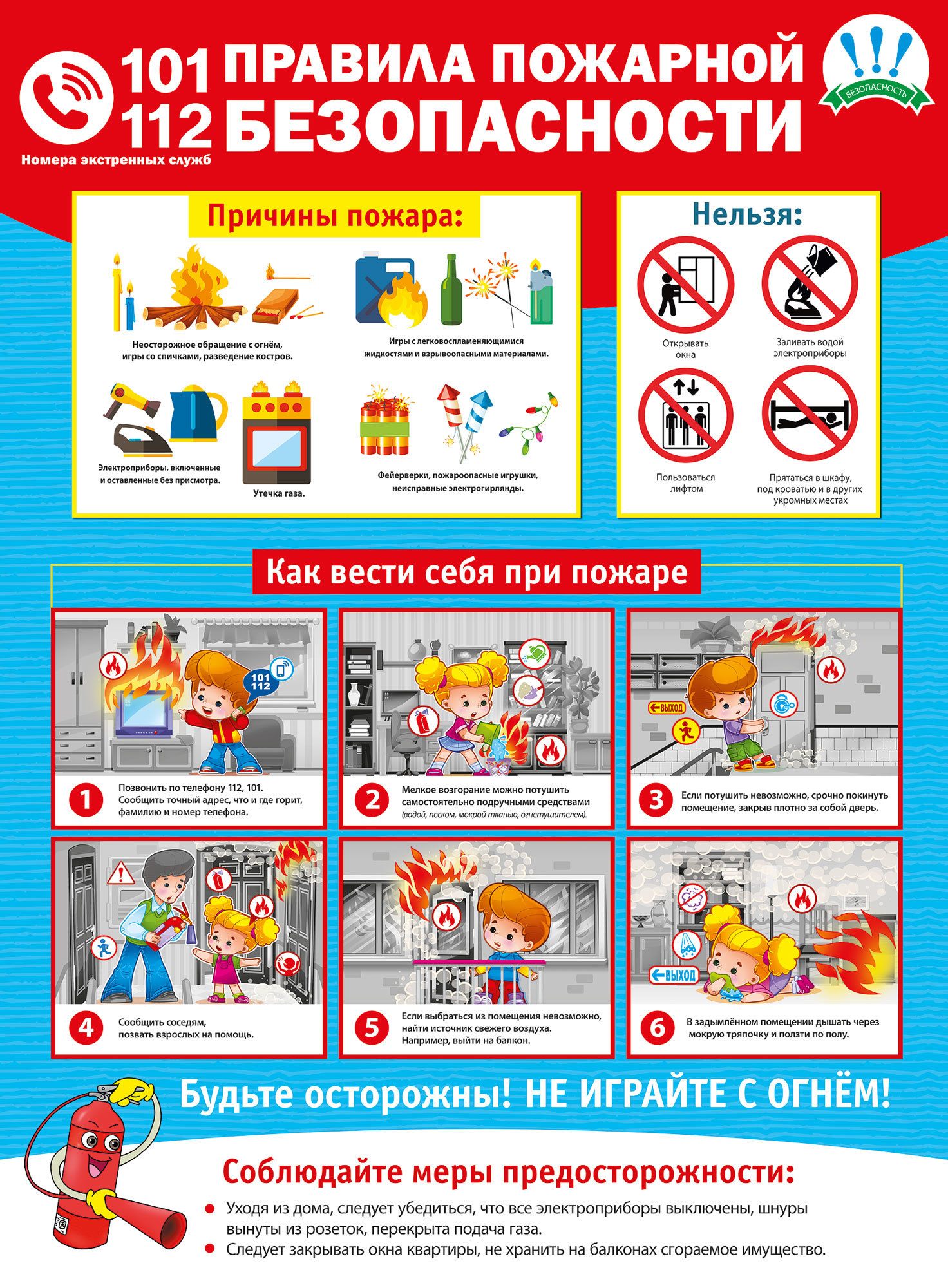 Красочное наглядное пособие для школьников удобного формата А2. На пособии представлены основные правила пожарной безопасности.