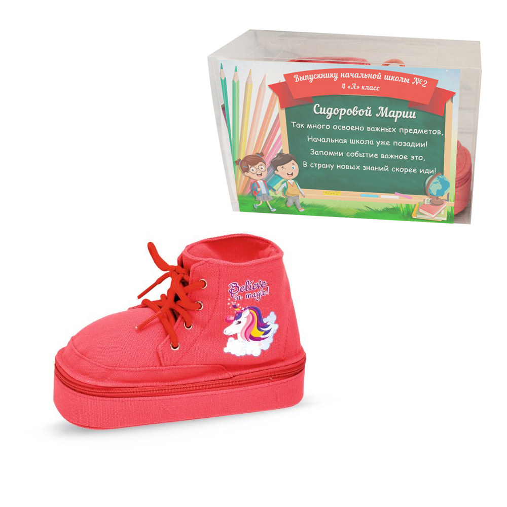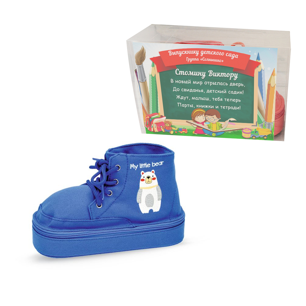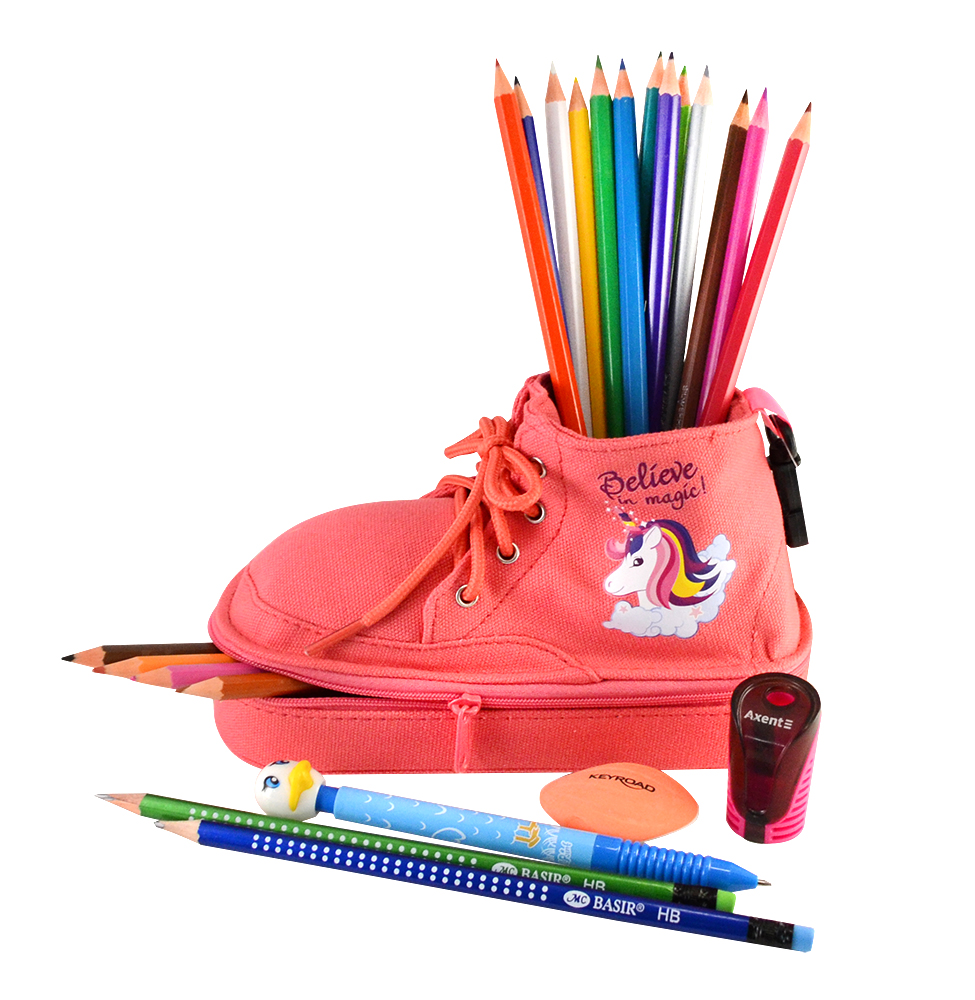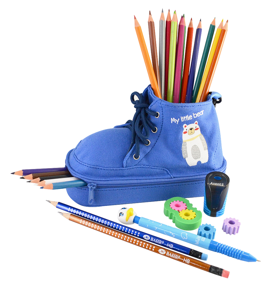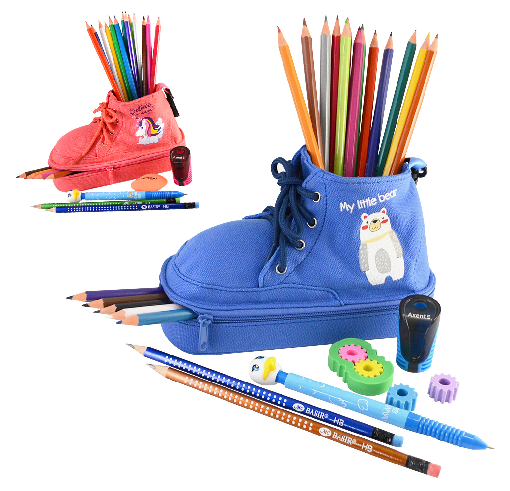 Набор канцелярских принадлежностей в красочном пенале с оригинальным дизайном в форме ботиночка. Пенал также можно использовать в качестве органайзера.