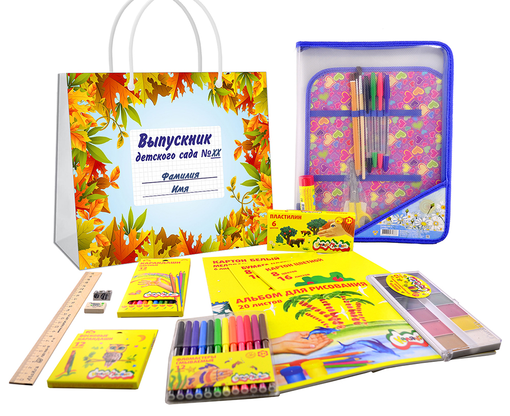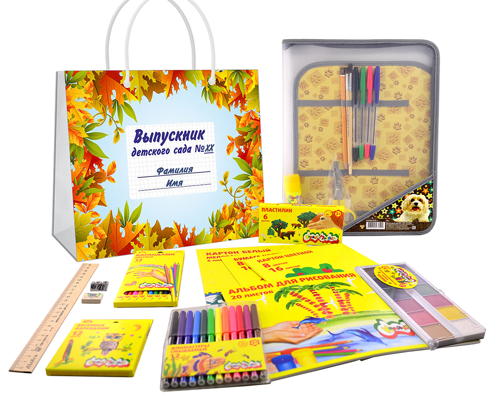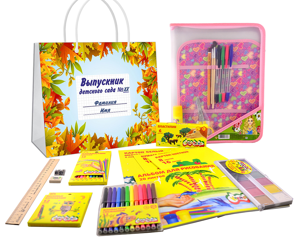 Набор канцелярских принадлежностей для будущего первоклассника! Набор укомплектован в пакет с крепкими ручками.
