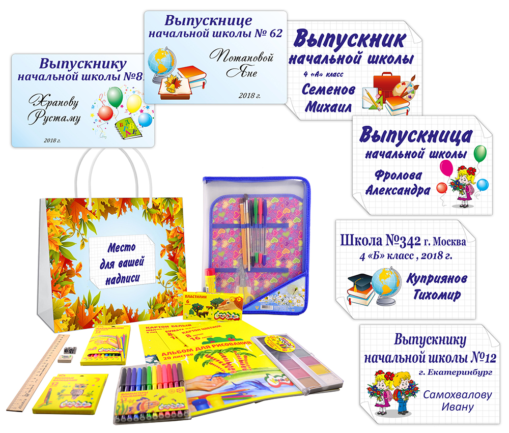 На лицевой стороне пакета - место для индивидуальной информации (на карточке возможно указать номер учебного заведения, имя, фамилию ребенка или любую другую индивидуальную информацию). Данная услуга входит в стоимость канцелярского набора.
