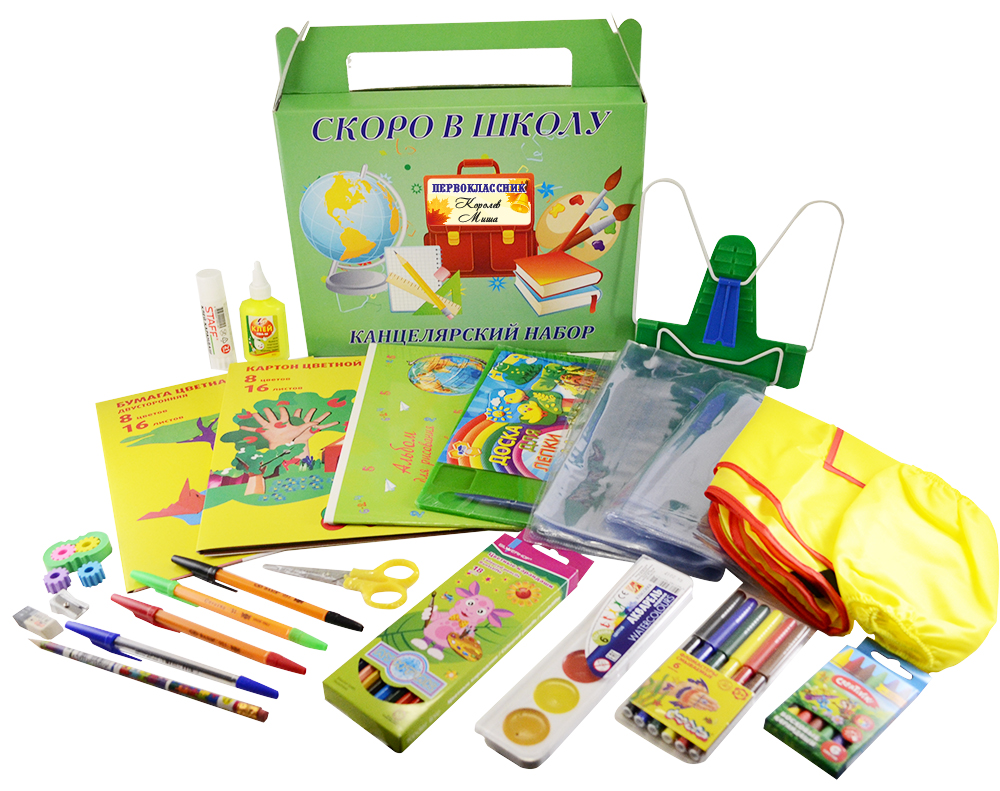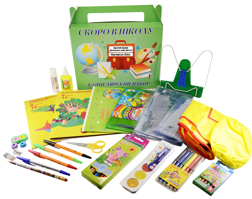 Набор канцелярских принадлежностей для будущего первоклассника! Набор укомплектован в красочную картонную коробку с крепкими ручками. На лицевой стороне коробки - место для индивидуальной информации (на карточке возможно указать номер учебного заведения, имя, фамилию ребенка или любую другую индивидуальную информацию). Данная услуга входит в стоимость канцелярского набора.