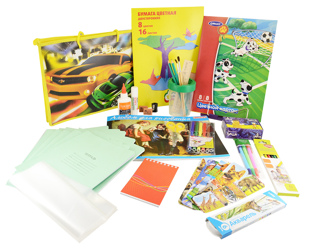 Набор канцелярских принадлежностей для будущего первоклассника! Набор укомплектован в красочную детскую папку с веревочными ручками.
