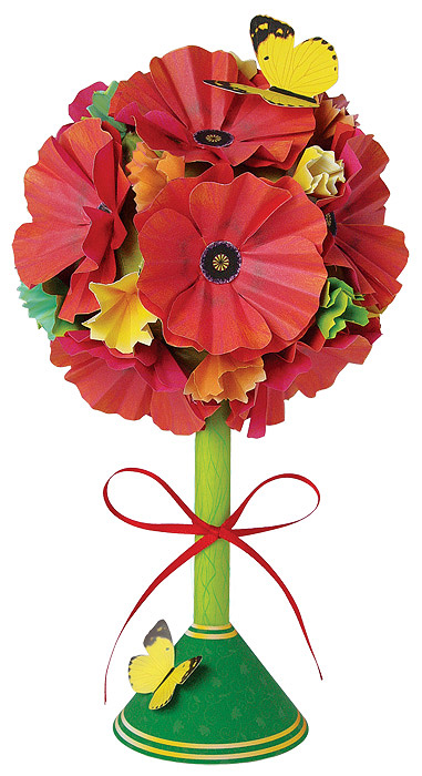 Деревце-топиарий могут сделать дети от 8-ми лет, - это несложно и увлекательно: сначала изготавливаются из бумаги цветы, а к ним дополнительные детали: бумага нарезается, складывается, подрезается или скручивается. Затем из картона складывается основа для кроны и изготавливается ствол и подставка. Собрав все картонные детали, украшаем шарообразную крону цветами и бабочками, божьими коровками; а ствол - яркой атласной лентой. Декоративные деревья, созданные в технике «Бумагопластика», словно из волшебного сада, появятся у вас в доме и будут украшать его круглый год!