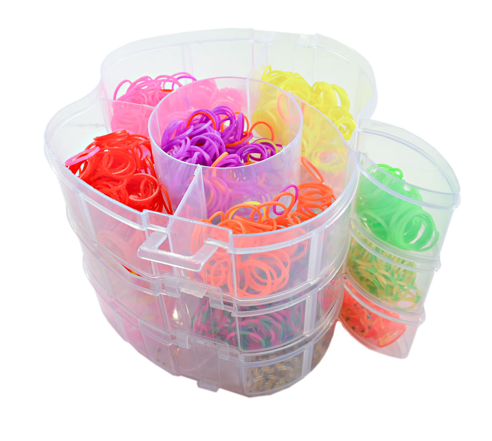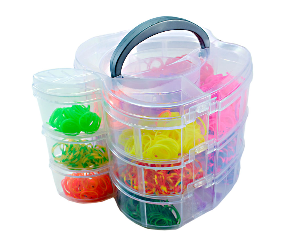 Набор состоит из ярких резиночек разных цветов. При работе у детей задействована мелкая моторика, развивается внимательность, усидчивость, творческая фантазия. Поделки с удовольствием демонстрируются друзьям, у них появляются новые темы для общения и совместных занятий. Все изделия можно расплести и создать что-то новое. Все резиночки собраны в удобный, многоярусный сундучок.