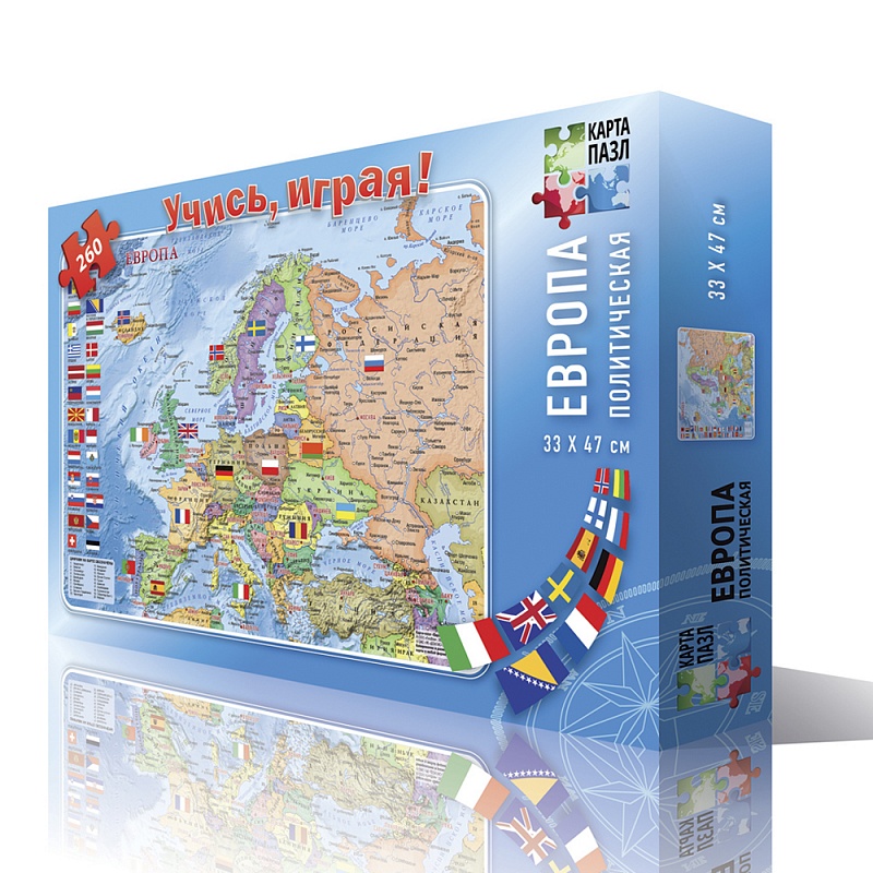 Ваш ребенок в процессе игры с большим интересом изучит политико-административное устройство Европы и познакомится с флагами государств. Карта-пазл Европы подойдет как для детей, так и для взрослых, желающих в простой, увлекательной форме познавать окружающий мир. Играя, ребенок развивает воображение, пространственное мышление, внимание, память и способность анализировать!