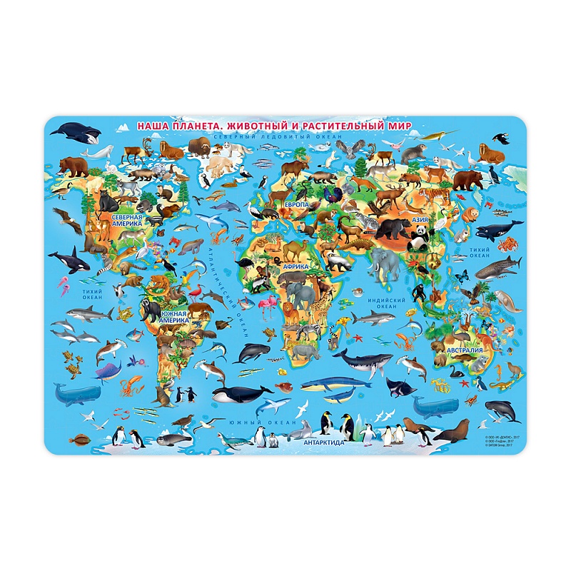 Эта карта-пазл позволяет в процессе интересной игры легко изучить и познать окружающий мир растений и животных! Ваш ребёнок с большим интересом изучит флору и фауну на различных материках и островах, а также обитателей океанов и морей. На карте отражены самые выдающиеся природные объекты (знаменитые водопады, горы, вулканы и т.д.). Играя, ребенок развивает воображение, пространственное мышление, внимание и память! Познавайте окружающий мир вместе с ребенком, собирая данную карту-пазл!
