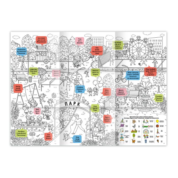 Серия гигантских раскрасок-постеров-это уникальное сочетание развлекательного элемента с обучающим в интересном формате. Раскраска развивает у ребенка мелкую моторику и креативное мышление. Ключевые объекты раскраски имеют названия на русском и английском языках, а также приведена транскрипция для правильного произношения английского варианта. Ребенку предлагаеся выполнить увлекательное задание на соотношение объекта и его англоязычного названия, которое поможет закрепить в памяти новые английские слова и их произношение.Чем раньше ребенок начнёт изучать иностранный язык, тем быстрее он сможет свободно владеть им читать, разговаривать и писать.