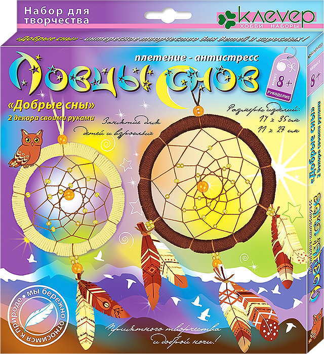 Украшение интерьера «Яркие сны» – яркое легкое изделие из пряжи, ниток, бусин и бумаги. В легендах индейцев говорится, что если поместить «ловца» возле спального места, то к спящему попадут только добрые и приятные сны, а кошмары застрянут в паутине. Процесс плетения этого изделия отлично расслабляет и снимает напряжение. Чтобы процесс изготовления ловца был более легким, мы разработали круг с выемками для намотки ниток, подобрали гармоничные соцетания разных материалов и цветов. Чтобы исключить любой вред для птиц, перья в этом наборе сделаны из красивой бумаги! Яркая и сочная раскраска пряжи и оперения придадут готовым ловцам снов выразительный вид, и помогут украсить интерьер.
