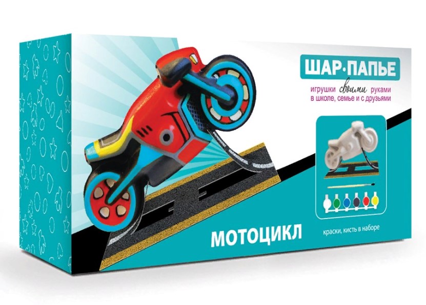 Впечатляющая новинка от «Шар-папье» — объемный мотоцикл! Раскрасьте его по своему вкусу: придумайте транспорт для супергероя или технику из будущего. В наборе есть белая заготовка, полностью готовая к раскрашиванию. Она сделана из легкого и экологичного материала, который напоминает обычное папье- маше, но радует большей прочностью.