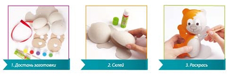 Такое творчество – отличный способ занять ребенка, познакомить его с росписью и научить делать игрушки своими руками. Объемная фигурка собирается из качественных заготовок, с которыми удобно работать. В наборе уже есть все необходимые аксессуары для сборки и раскрашивания, а также подробная инструкция.