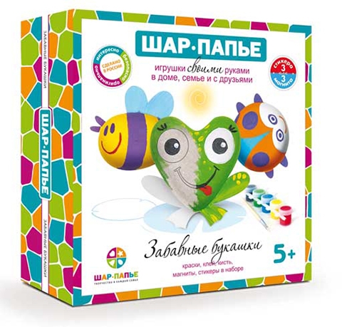 В комплекте: заготовки из папье-маше для создания 3 фигурок, вставки из гофрокартона, краски, кисть, клей, магниты, стикеры