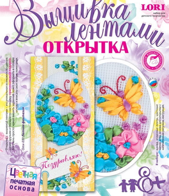 С помощью данного набора для вышивания лентами получается чудесная открытка, созданная своими руками. Вышивка атласными лентами смотрится очень красиво и необычно: цветы, бабочки, стрекозы, приобретая объем за счет лент, словно оживают на картинке. А главное, что такую открытку (в готовом виде) нельзя купить ни в одном магазине. Если Вы или Ваш ребенок любите вышивать, то от вышивки лентами получите истинное удовольствие, а готовую открытку можно с гордостью преподнести любимым родным или друзьям.