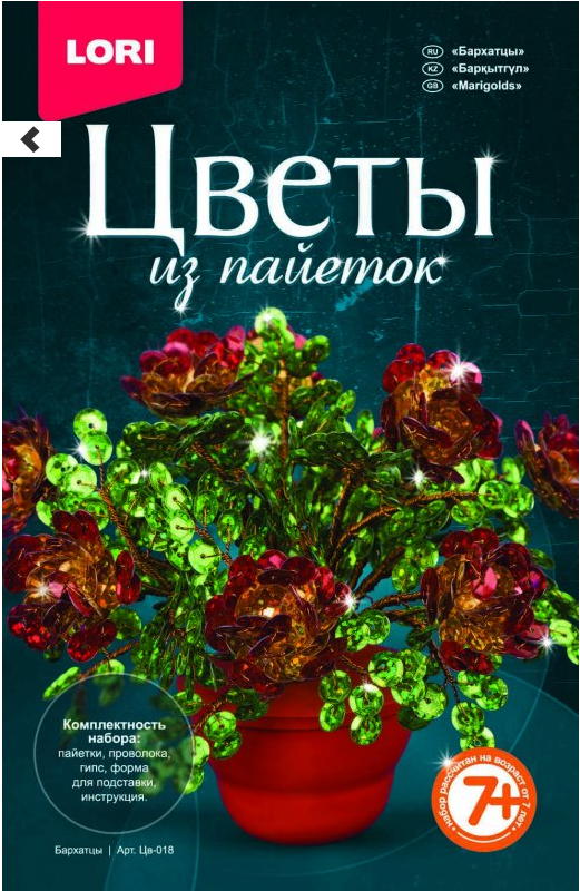 Набор для творчества "Цветы из пайеток" позволит ребенку заняться достаточно сложным и кропотливым, тем не менее очень интересным видом искусства. С помощью проволоки и блестящих разноцветных пайеток можно будет создать красивые сувенирные бархатцы, а затем поместить их в гипсовую основу, похожую на аккуратный горшочек.