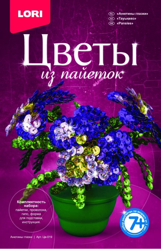 С набором для творчества "Цветы из пайеток" от бренда LORI можно создать оригинальный букетиканютиных глазок на подставке в форме горшочка. В данный набор входят все необходимыепредметы, такие, как гипс, форма для отливки горшочка, разноцветные пайетки и проволока, накоторую они собираются. Благодаря инструкции, также входящей в набор, ребенок сможетсамостоятельно сделать оригинальную поделку и украсить ей интерьер детской комнаты илиподарить близким.