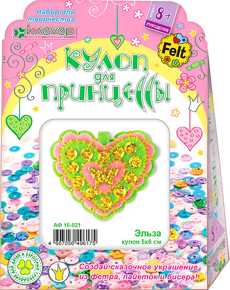 Кулон для принцессы в розово-салатовой с золотом гамме создан для девочек, которые любят наряжаться как принцессы! Сделать сказочный кулон легко - нужно пришить на уже выкроенные из фетра детали блестящие пайетки и бисер. Маленькая принцесса не только получит интересное украшение, но и приобретёт начальные навыки шитья. Если убрать подвес, можно нашить украшение на кофточку, шапочку, сумку или заколку! Вам понадобится игла.