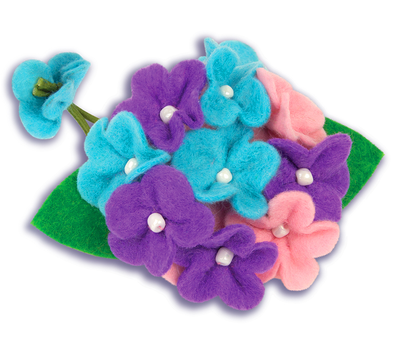 Изысканное сочетание голубых, фиолетовых и розовых маленьких цветочков гортензии придаёт изюминку причёске! Яркий объёмный цветок из мягкого фетра отлично смотрится в волосах, стягивая хвост или косу. Его также можно прикрепить на ободок для волос или пришить на кофточку или сумочку. Рукодельнице старше 8 лет будет несложно сделать его, нужно только обладать начальными навыками кройки и шитья: вырезать из фетра по выкройке детали цветка, сделать складки у лепестков и сшить детали между собой, нашить жемчужную бусину и прикрепить к резинке по инструкции. Созданный своими руками дизайнерский цветок украсит причёску, а само его создание доставит большое удовольствие!