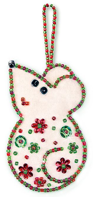 Мышка-патч - стилизованная фигурка из белого фетра, декорированная разноцветными бисеринами и блестящими пайетками в праздничном дизайне. Ребёнок старше 8 лет перенесёт выкройку на фетр, вырежет упрощённый силуэт, нашьёт бисерные нити и пайетки по инструкции. Мышка станет украшением одежды или игрушкой на ёлку!
