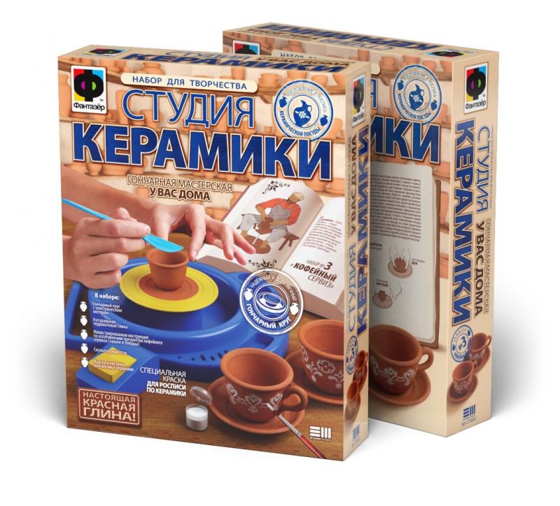 В состав набора входит гончарный круг с электрическим мотором, натуральная красная гончарная глина, иллюстрированная инструкция по изготовлению, скульптурный стек и специальная краска по росписи по керамике. У гончарного круга увеличена мощность (чтобы не ограничиваться изготовлением только небольших поделок), вращение гончарного круга управляется удобным ножным приводом. Керамические чайные и кофейные сервизы, фужеры и стаканы, вазы, цветочные горшки, подсвечники, и многое другое можно слепить и раскрасить белилами, благодаря иллюстрированной инструкции из набора.