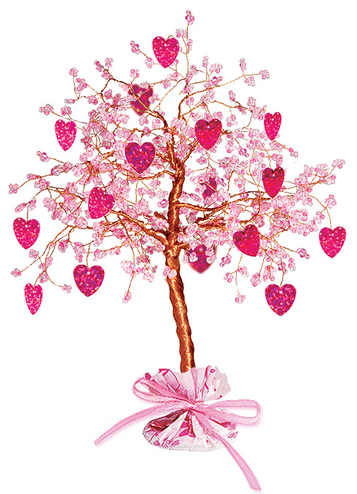 Дерево - удивительное растение, символ энергии и жизни, познаний и добра во множестве сказок и легенд. Сегодня очень популярны миниатюрные ювелирные деревца. Считается, что деревья с яркими листочками и переливающимися сердечками приносят своему обладателю удачу и любовь. Деревце любви сделать очень легко: скрутить концы проволочки с нанизанными бисером и пайетками, скрутить проволочки между собой, обмотать концами проволок ствол деревца, закрепить подарочную плёнку бантом - и декоративное деревце удивительной красоты готово!