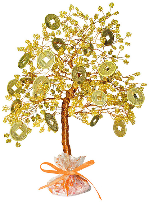 Дерево – удивительное растение, символ энергии и жизни, познаний и добра во множестве сказок и легенд. Сегодня очень популярны миниатюрные ювелирные деревца. Считается, что деревья с "золотыми" листочками и монетами приносят своему обладателю богатство и увеличивают доход. Денежное дерево со "старинными" монетами сделать очень легко: скрутить концы проволочки с нанизанным бисером, скрутить проволочки между собой, обмотать концами проволок ствол деревца, закрепить подарочную плёнку бантом – и декоративное деревце удивительной красоты готово!