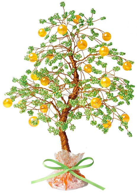 Дерево - удивительное растение, символ энергии и жизни, познаний и добра во множестве сказок и легенд. Сегодня очень популярны миниатюрные ювелирные деревца. Считается, что деревья с плодами приносят своему обладателю здоровье и долголетие. Апельсиновое дерево с ярко-оранжевыми бусинками сделать очень легко: скрутить концы проволочки с нанизанным бисером, скрутить проволочки между собой, обмотать концами проволок ствол деревца, закрепить подарочную плёнку бантом – и декоративное деревце удивительной красоты готово!