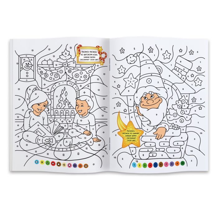 В раскраске представлены различные техники раскрашивания рисунков: по цветным точкам, по цифрам, по фигурам, соедини и раскрась.