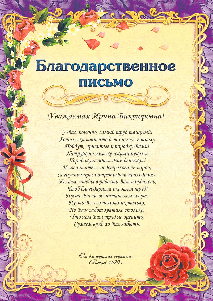Благодарность педагогам написана в стихотворной форме вензельным почерком (готовый шаблон).
