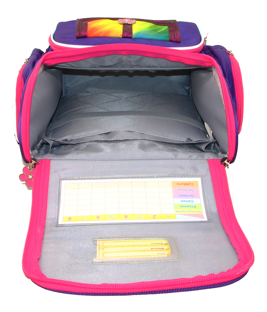 Внутреннее пространство ранца содержит большое основное отделение, два «плавающих отделения», которые фиксируются резинкой и отделение с вентилируемой сеточкой. Под верхней крышкой ранца расположено пластиковое окошко со сменным расписанием уроков и бейджик.