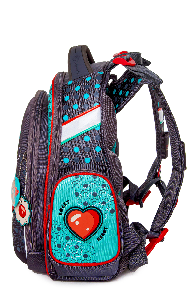 - два больших отделения на молниях. В основном, самом большом отделении расположены жесткие перемычки- вставки, для комфортного размещения тетрадей или учебников. В переднем отделении предусмотрен органайзер с карманом для мобильного телефона, сетчатым карманом для мелочей, отделениями для ручек и карандашей, подвеской для ключей;