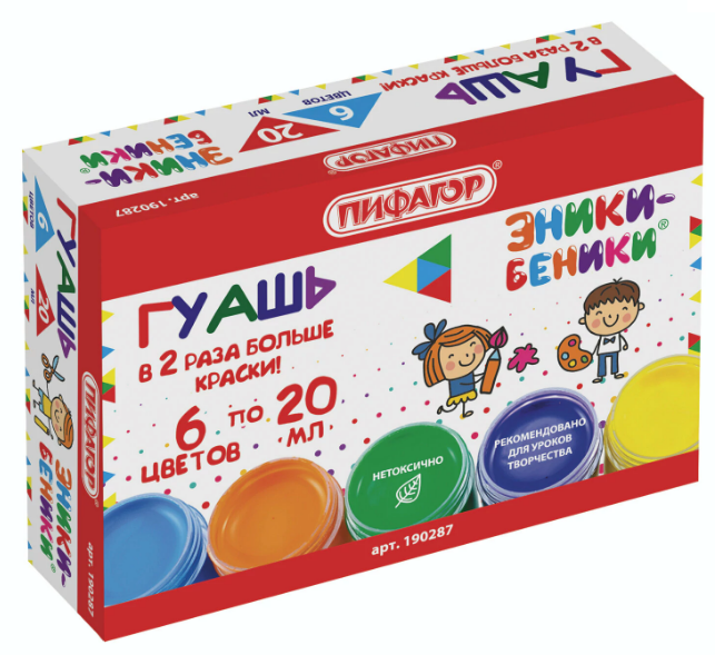 Гуашь 6 цветов, ПИФАГОР "ЭНИКИ-БЕНИКИ" 20 мл, без кисти, картонная упаковка, 190287