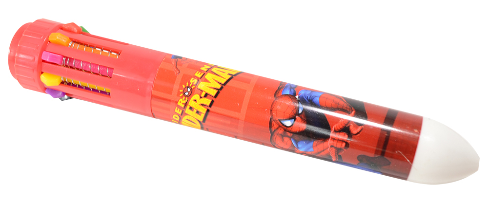 Шариковая авторучка в красном пластиковом корпусе с фольгированными рисунками любимых героев. Внутри корпуса десять стержней разного цвета, которые выдвигаются с помощью соответствующего пластикового рычага на конце ручки.