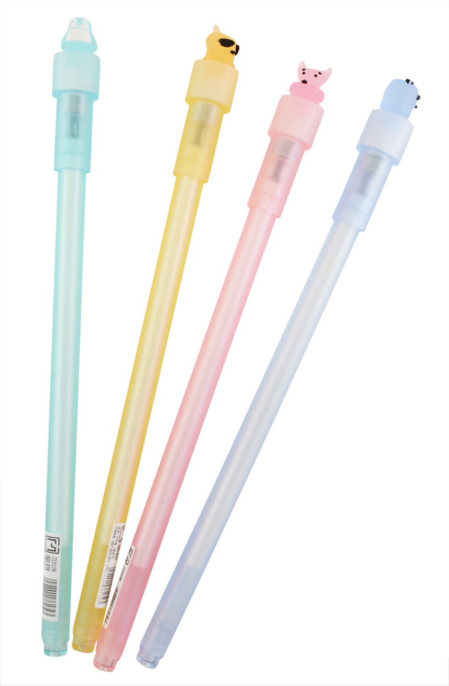 Черная гелевая ручка в тонированном пластиковом корпусе. На колпачке ручки имеется фигурка животного на пружине, которая прячется когда колпачок снят.