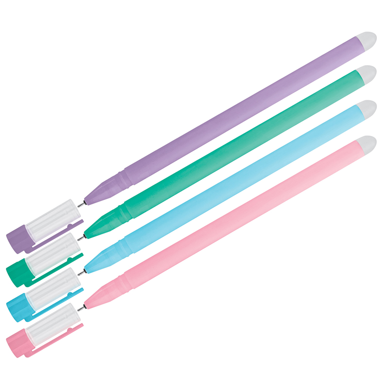 Ручка гелевая стираемая, синие чернила. 4 цвета корпуса в пастельных тонах. Антискользящий корпус. Игольчатый пишущий узел 0,5 мм. Термочувствительные чернила становятся невидимыми при нагревании. Нагрев достигается трением встроенным в корпус ручки ластиком. Обесцвеченные чернила проявляются при низкой температуре.