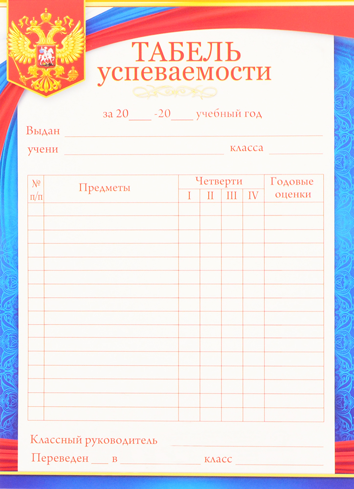 Табель - таблица успеваемости школьника, в которой перечислены изучаемые предметы и итоговые оценки по периодам (четвертям). Дизайн выполнен в строгом стиле с символикой Российской федерации.
