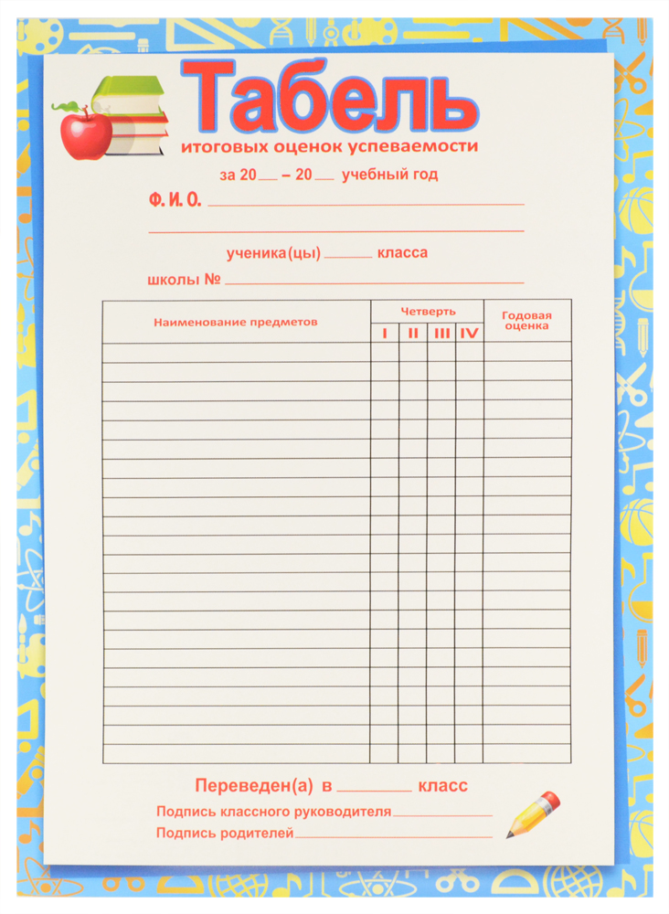 Табель из мелованного картона - таблица успеваемости школьника, в которой перечислены изучаемые предметы и итоговые оценки по периодам (четвертям).