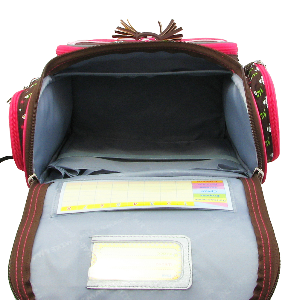 Внутреннее пространство ранца содержит большое основное отделение, два «плавающих отделения», которые фиксируются резинкой и отделение с вентилируемой сеточкой. Под верхней крышкой ранца расположено пластиковое окошко со сменным расписанием уроков и бейджик.