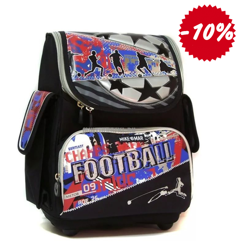 Школьный рюкзак - Футбол Mike-Mar:1075-MM-06 Новая облегченная модель. Качество исполнения: Рюкзак изготовлен из специального влагоотталкивающего материала с защитой от ультрофиолетового излучения. Конструкция: удобные эргономичные лямки; ортопедическая спинка; невесомый алюминиевый каркас в спинке ранца; Многослойная сетчатая подкладка спинки и лямок; Плотное пластиковое дно на ножках, защищающее от загрязнений, влаги и придающее устойчивость; Боковые карманы ранца на клапанах липучках; Вместительный передний карман для школьного пенала; Светоотражающие элементы со всех сторон школьного рюкзака.