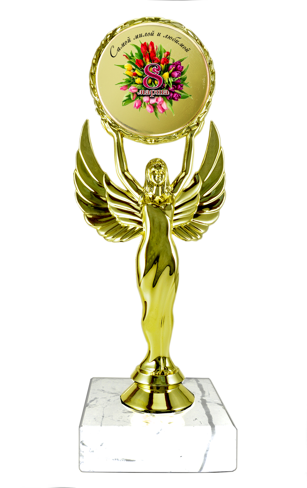 Статуэтка Ника с эмблемоносителем на мраморном камне 8 марта "Самой милой и любимой"