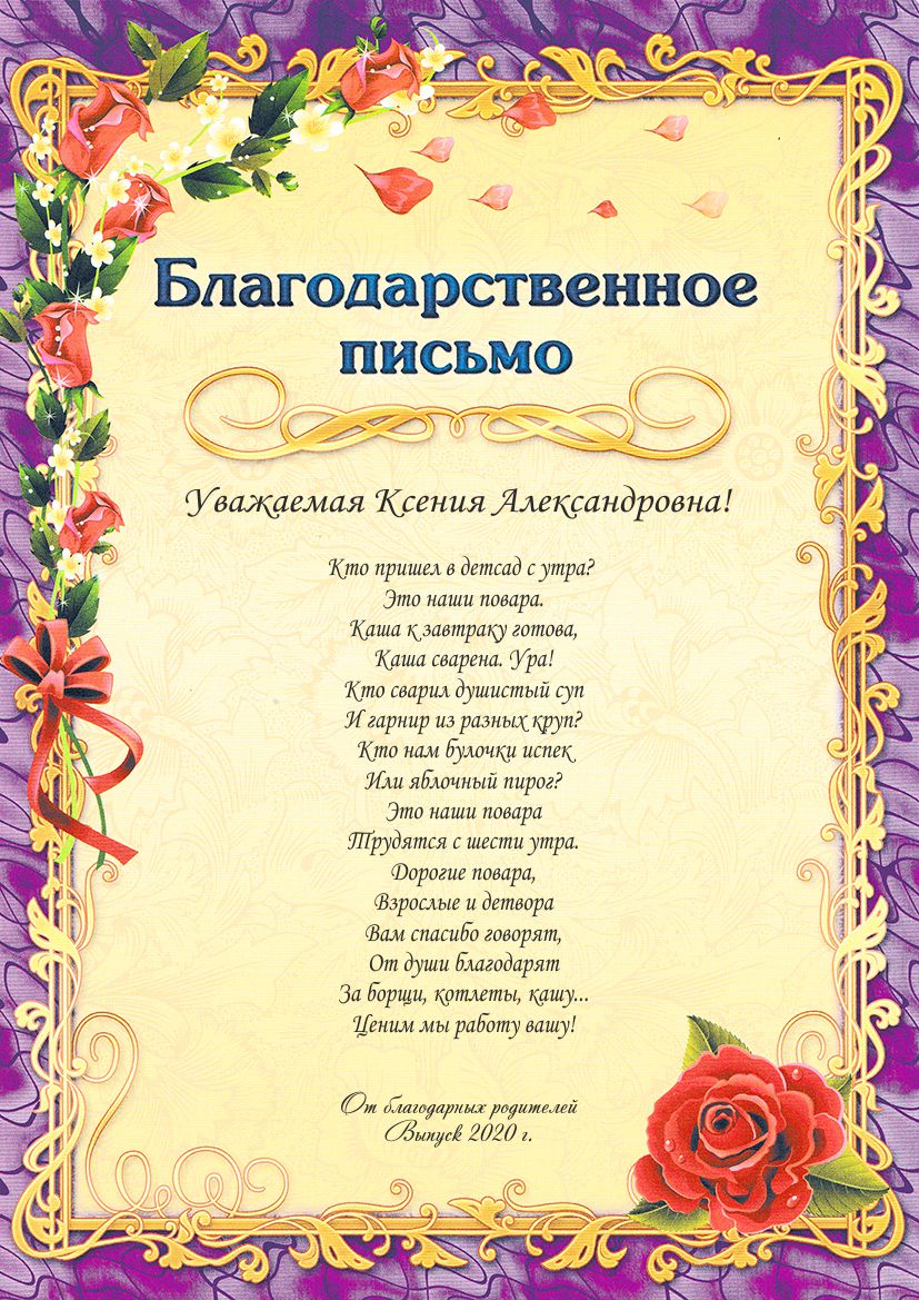 Образец именной благодарности для Повара (вносим ИО Вашего педагога)*