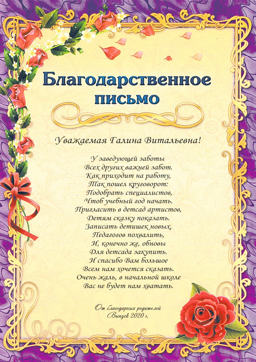 Образец именной благодарности для Заведующей (вносим ИО Вашего педагога)*