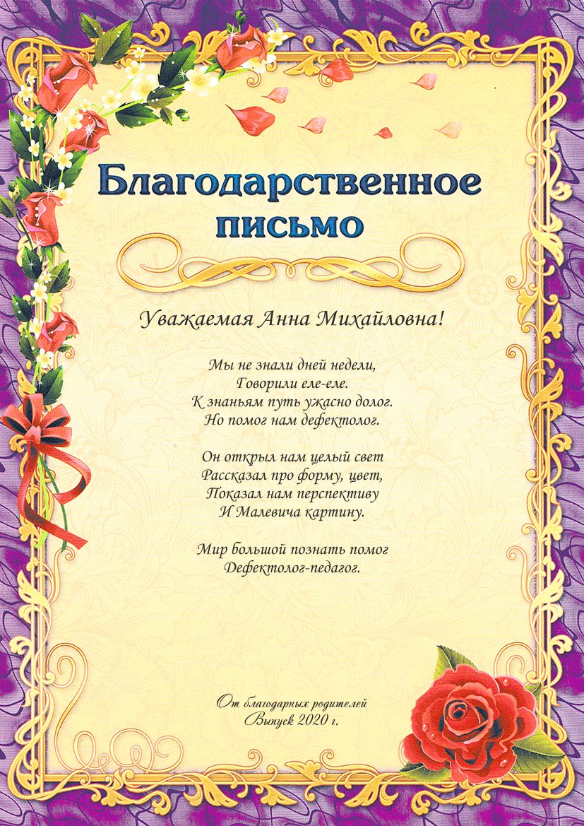 Образец именной благодарности для Дефектолога (вносим ИО Вашего педагога)*