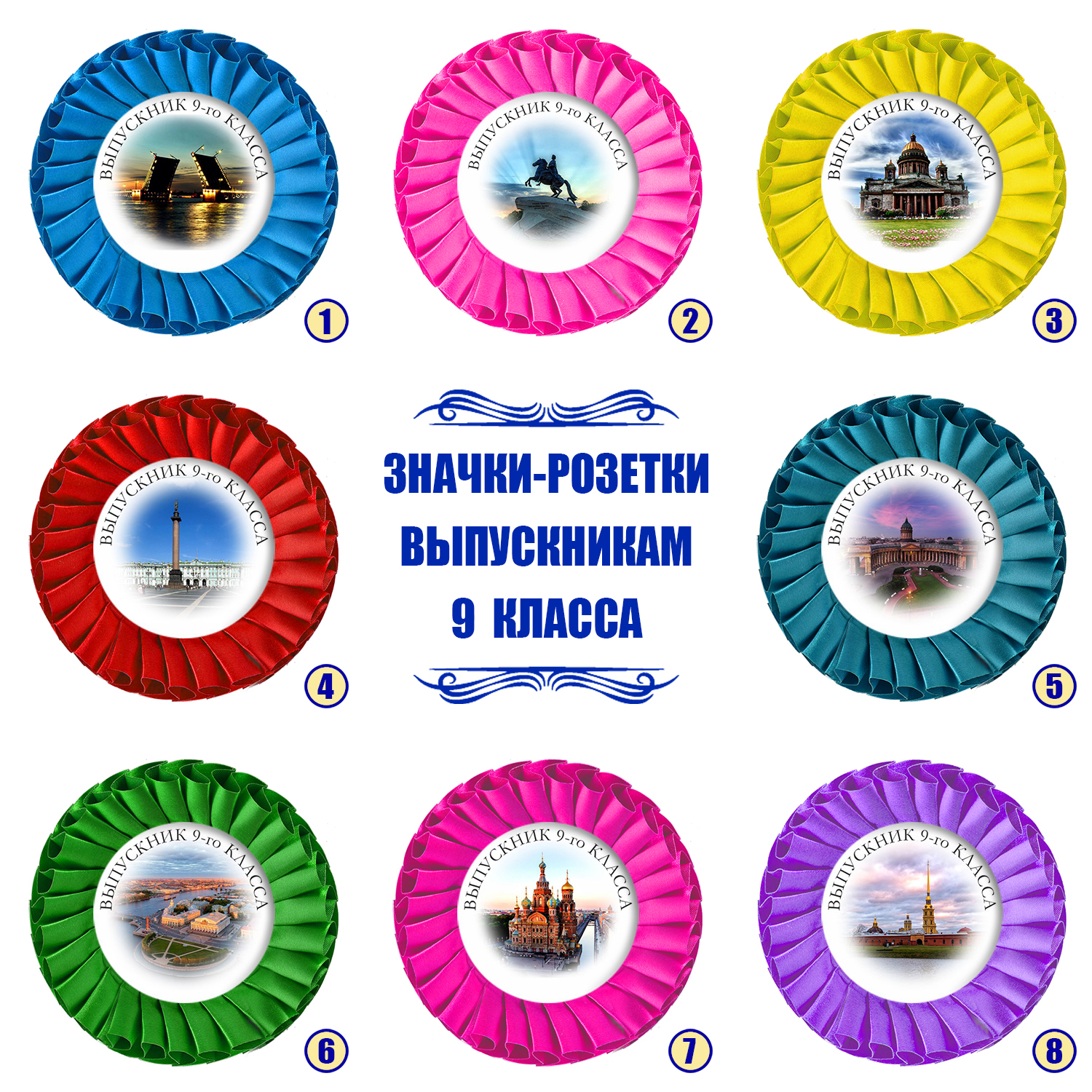 Значок-розетка с фотографией ученика или учителя, а так же с именем будет стоить + 50 рублей к стоимости.