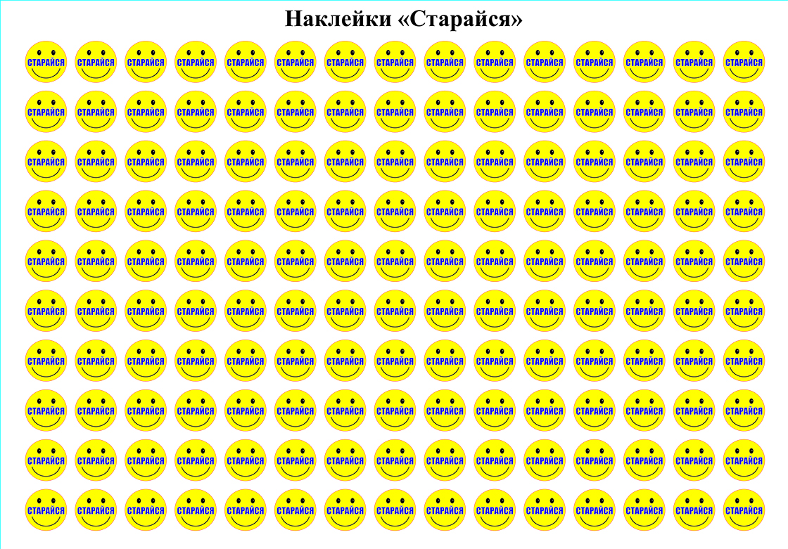 Наклейки с забавным "смайликом" и надписью "Старайся" помогут учителям младших классов отметить успехи малышей.