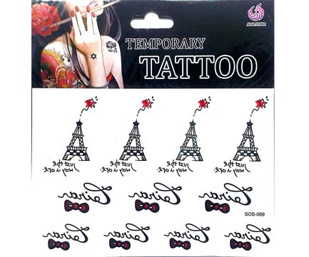 Набор наклеек, которые с которыми дети смогут поиграть в татуировки. В наборе четыре рисунка с Эйфилевой башней и семь надписей "Париж".